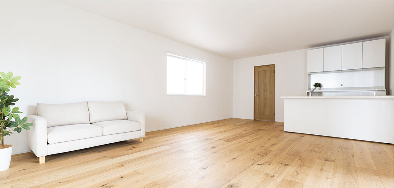 真っ白な壁・フローリング・階段の自然光が差し込む空間デザイン。