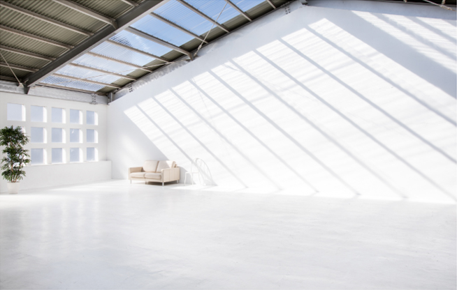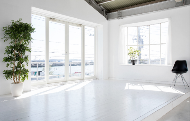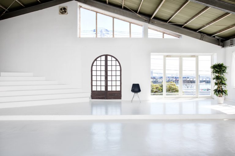 真っ白な壁・フローリング・階段の自然光が差し込む空間デザイン。 広さを利用した大人数での撮影が可能です。